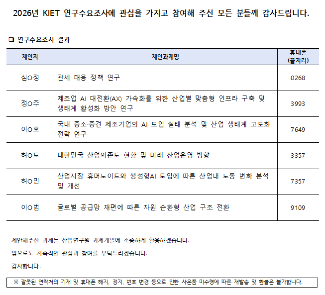 2026년 산업연구원 대국민 연구수요조사 결과