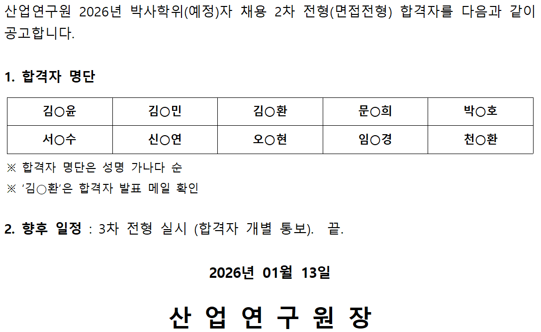 2026년 박사학위(예정)자 채용 2차 전형(면접심사) 합격자 공고