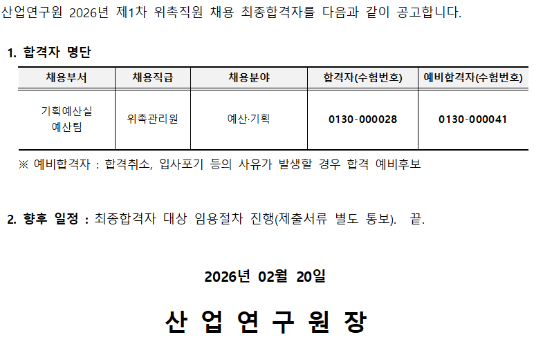 2026년 제1차 위촉직 채용 2차 전형(면접심사) 합격자 공고