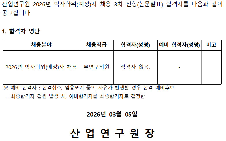 2026년 박사학위(예정)자 채용 최종합격자 공고