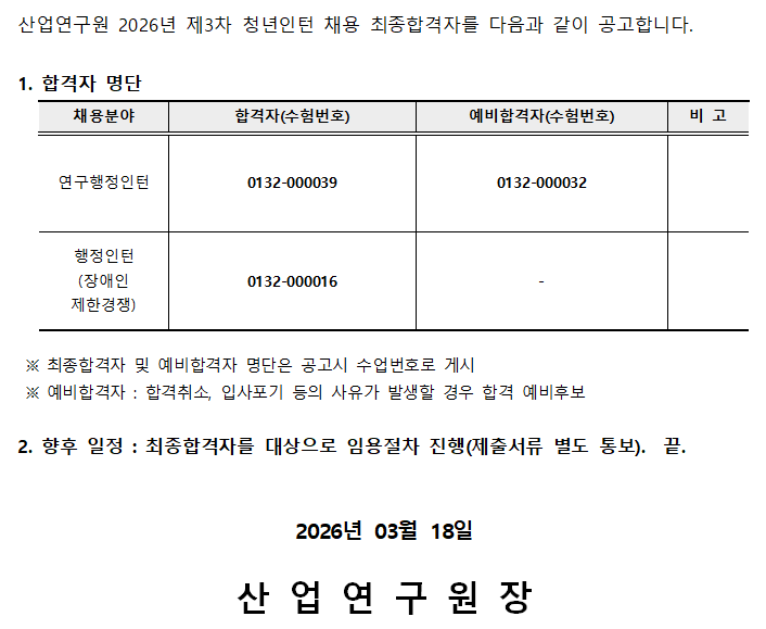 2026년 제3차 청년인턴 채용 최종합격자 공고