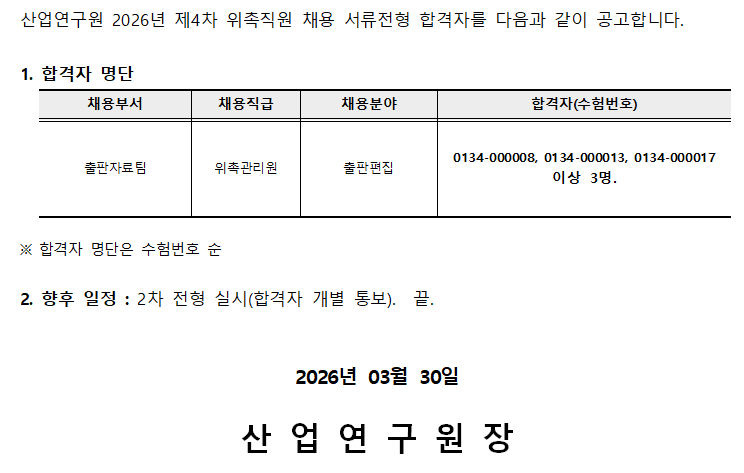 2026년 제4차 위촉직 채용 1차 전형(서류심사)합격자 공고