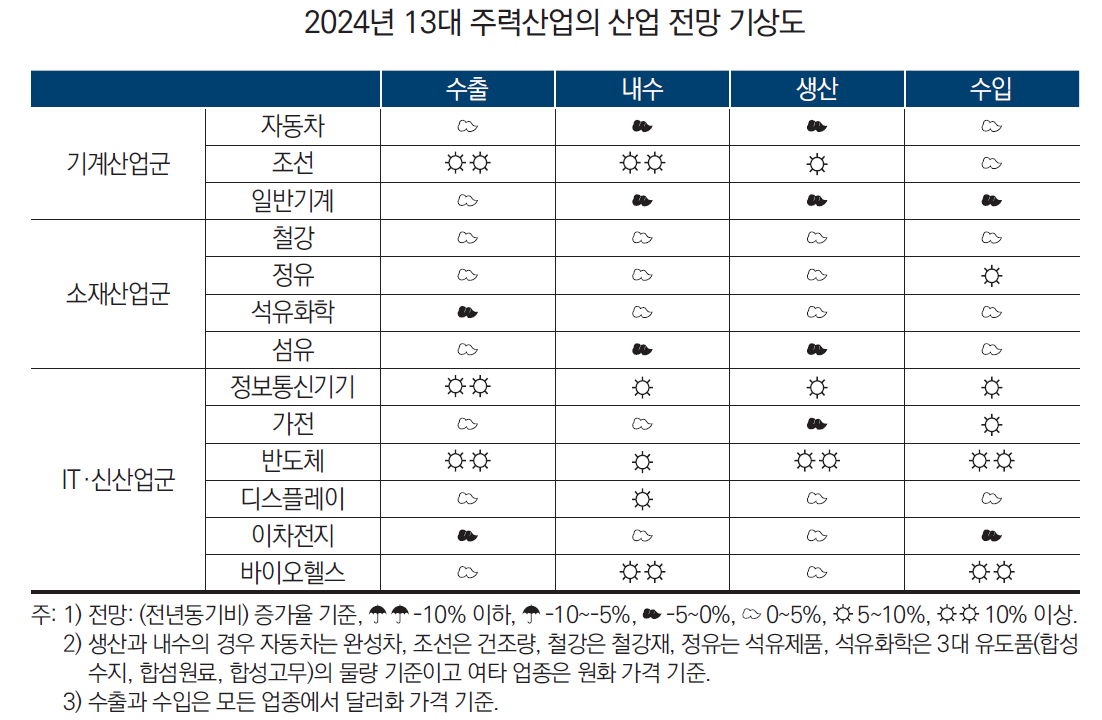 2024년 13대 주력산업은 고금리-고물가 기조와 국내외 경제의 제한적 성장 속에서도 글로벌 IT 경기의 완만한 회복이 국내 수출, 투자 및 생산 확대로 이어지며 대다수 산업에서 긍정적인 회복세가 나타날 것으로 예상된다. 종합적으로 볼 때, 반도체, 정보통신기기, 디스플레이, 바이오헬스 등의 IT신산업군과 조선산업의 성장 호조가 예상되고 철강, 석유화학과 같은 기초소재 산업은 올해와 비슷할 것으로 보이나 자동차와 이차전지산업은 성장세가 둔화 또는 감소할 전망이다. 2024년 13대 주력산업의 수출은 세계 경제의 제한적 성장 속에서도 2023년(전년비 -10.5%)보다 5.2% 증가할 전망이며, 특히 글로벌 ICT 수요 회복과 기저효과 영향으로 IT신산업군이 반도체(15.9%), 정보통신기기(12.7%) 등의 주도로 전체 수출 확대를 견인할 것으로 예상된다. 내수도 ICT 신제품 출시와 수출용 중간재 수요 증가 및 하반기 경제지표 개선으로 성장이 예상되는 가운데 수출과 내수 회복에 따라 IT신산업군 및 소재산업군 중심의 생산 확대가 예상된다. 내수와 수출 정체가 예상되는 자동차(-2.3%)는 생산이 소폭 감소하고, 수출용 배터리 수요 정체로 이차전지(1.1%) 생산은 제한적 증가가 예상된다. 한편, 조선은 2021년 수주한 고선가 선박의 인도가 지속되며 2024년에도 수출과 생산의 높은 성장세가 나타날 전망이다