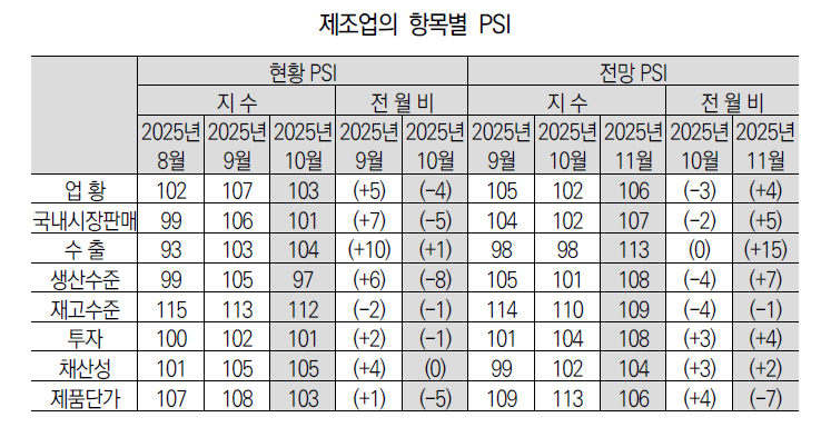 2025년 10월 제조업 현황 : 업황 현황 PSI 4개월 연속 기준치 상회(107 → 103), 생산 기준치 소폭 하회