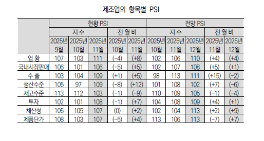 2025년 11월 제조업 현황 : 업황 현황 PSI 연중 최고치로 반등(103 →111), 생산수준(109) 기준치 상회 전환