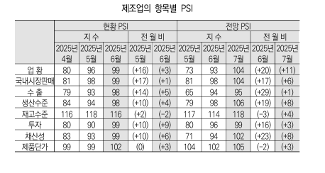 2025년 6월 제조업 현황 : 업황 현황 PSI 기준치 소폭 하회(96 → 99),  내수·수출 동반 추가 상승